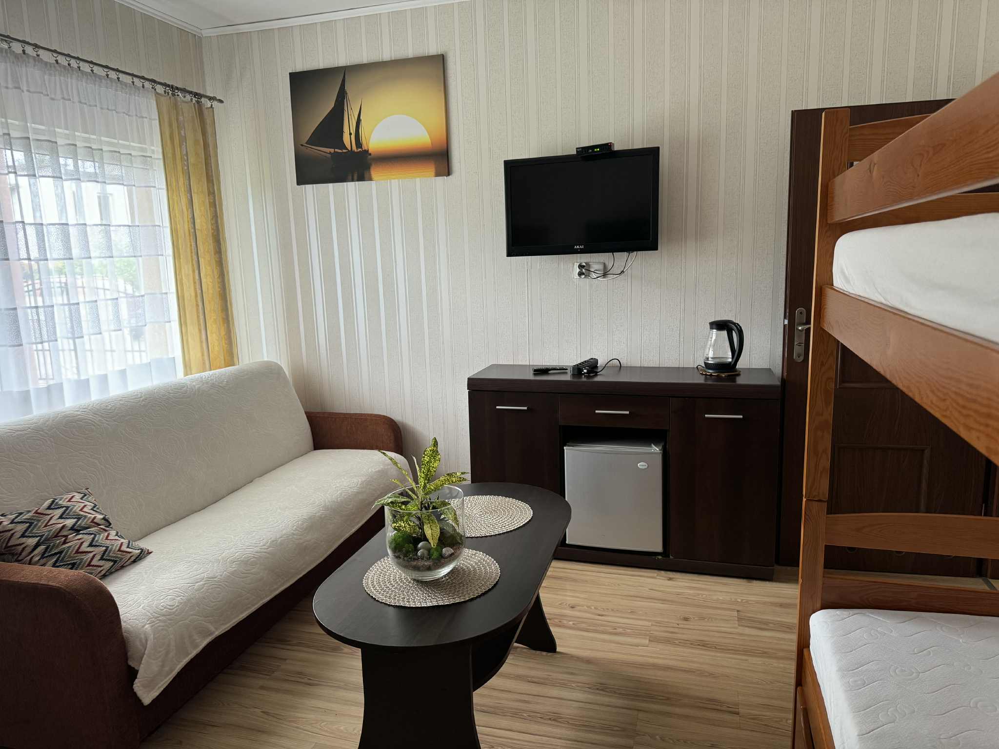 W ofercie mamy również pokoje w murowanym domu. Pokoje są 3 i 4-osobowe z łazienką, TV oraz lodówką, usytuowane na parterze. Cena 280 zł/doba pokój. Ceny mogą się różnić w zależności od długości pobytu oraz terminu.